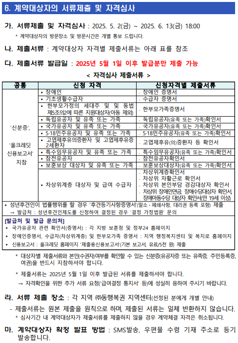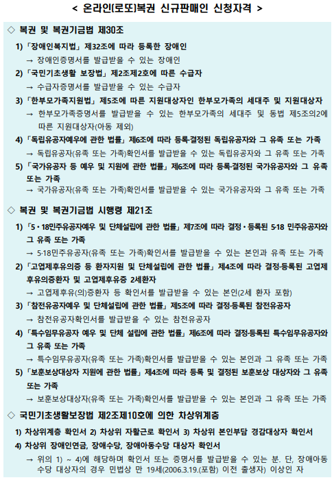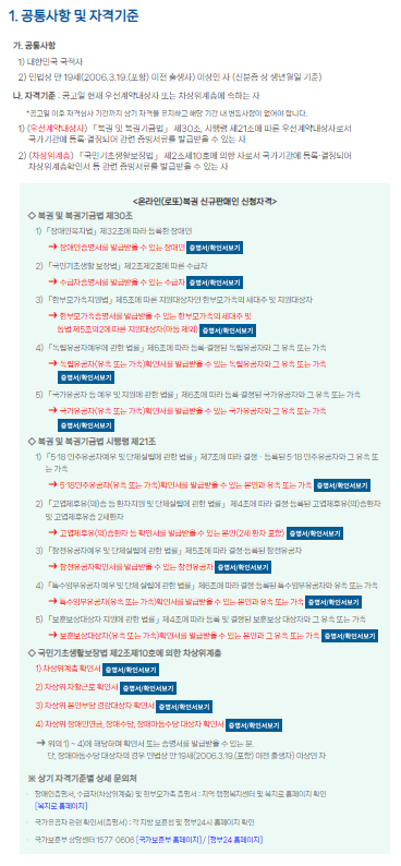 - 장애인증명서, 수급자(차상위계층) 및 한부모가족 증명서 : 지역 행정복지센터 및 복지로 홈페이지